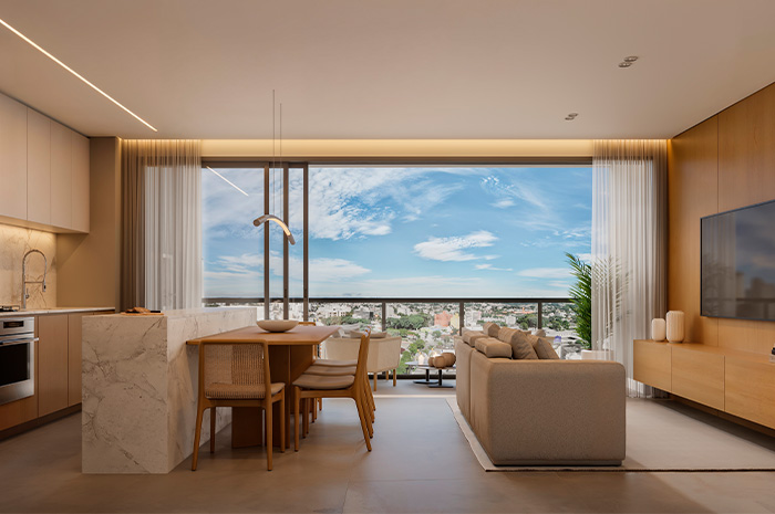- Ventilação cruzada: o projeto das janelas e sacadas permite que o ar circule de forma natural, trazendo frescor e leveza para todos os ambientes, conectando o interior ao clima da cidade.